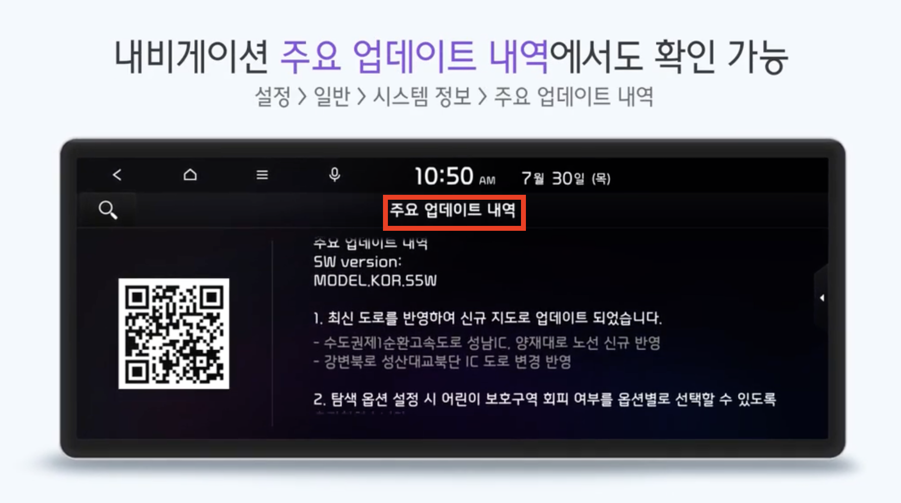 2. 업데이트 완료 후 시동을 켜면 완료 팝업에 QR코드를 스캔하여 보다 상세한 내용을 확인할 수 있습니다.