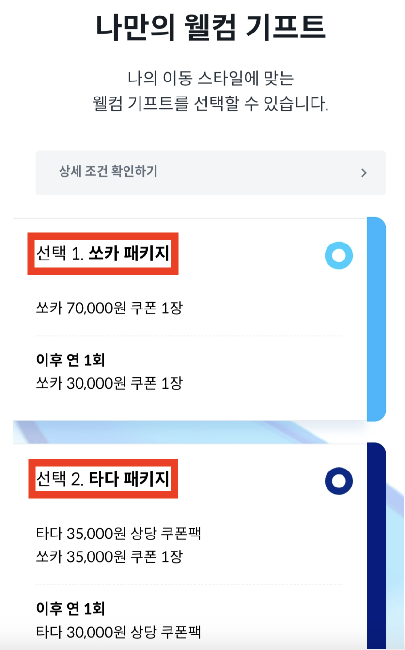 쏘카 패스포트 가입 시에는 웰컴 기프트가 제공됩니다. 이 기프트는 '쏘카 패키지' '타다 패키지' 두 가지로 나뉘어져 있습니다.