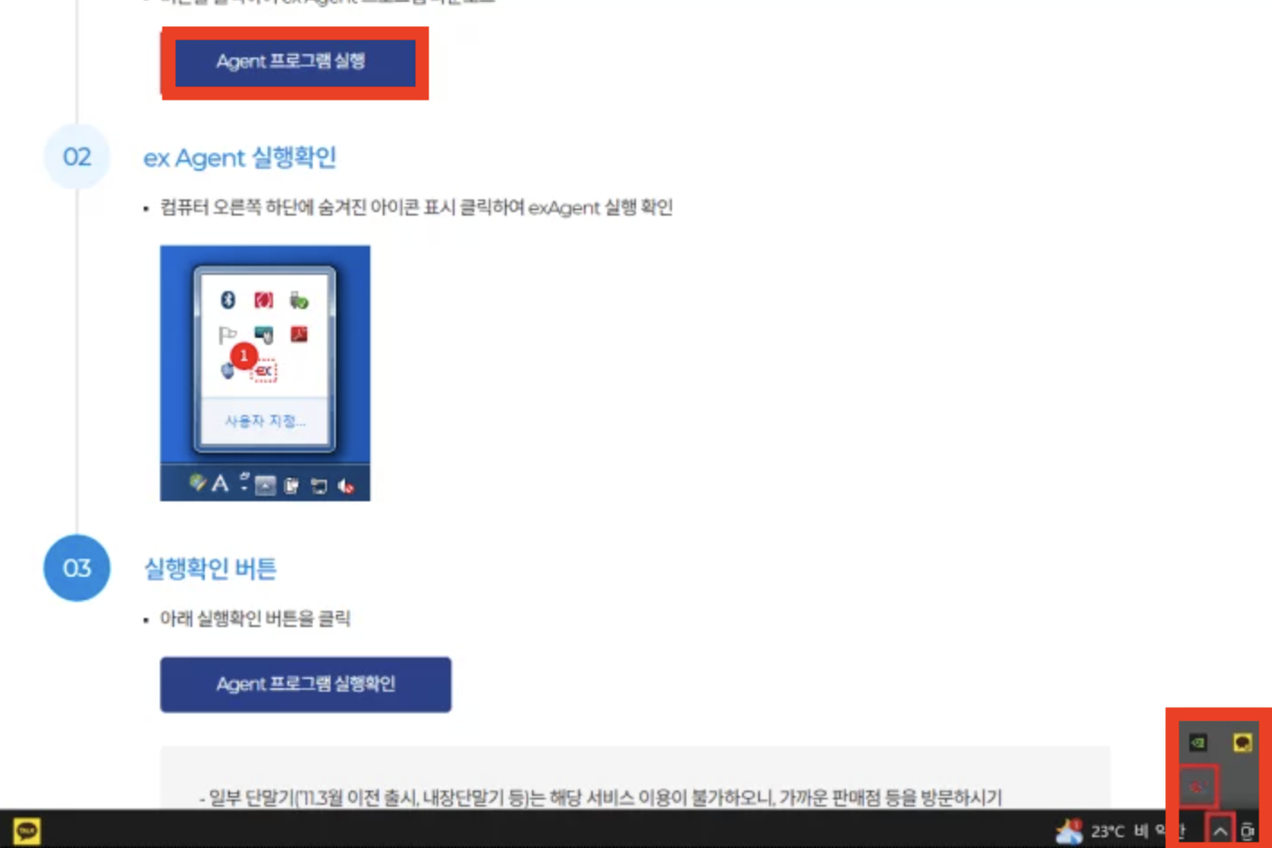 [Agent 프로그램 실행] 버튼을 클릭하면 [exAgent] 파일을 다운로드할 수 있습니다. 그 후 해당 파일을 클릭한 후 실행하면 컴퓨터의 하단 트레이 아이콘에서 해당 프로그램이 실행 중임을 확인할 수 있습니다. 이후 하이패스 단말기를 USB 포트를 통해 컴퓨터나 노트북에 연결하면 자동으로 인식되어 차량 등록 정보를 입력할 수 있는 화면이 표시됩니다.