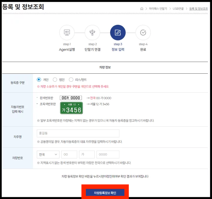 3. 정보 입력 화면에서 차량 소유자 이름과 차량 번호를 입력한 후 '차량 등록 정보 확인'을 클릭하면 본인 인증을 위한 화면이 표시됩니다. 하이패스 단말기의 등록 및 개통은 해당 차량의 소유자만이 가능합니다.