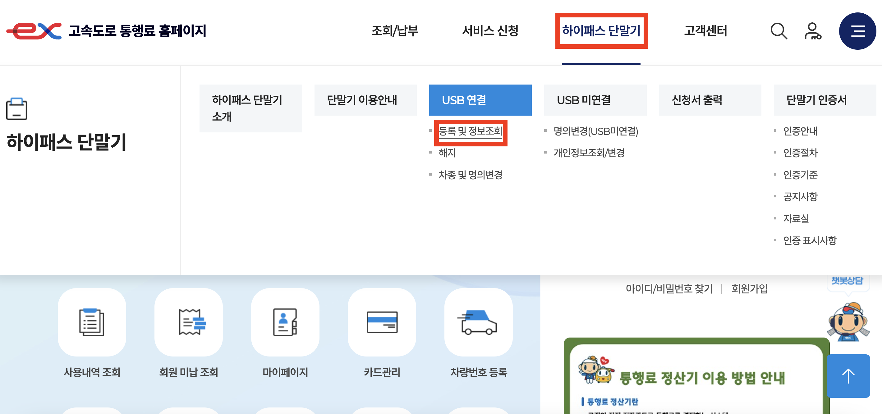 1. 고속도로 통행료 홈페이지에 접속하신 후 상단의 '하이패스 단말기' > 'USB 연결' > '등록 및 정보조회'를 클릭하세요.