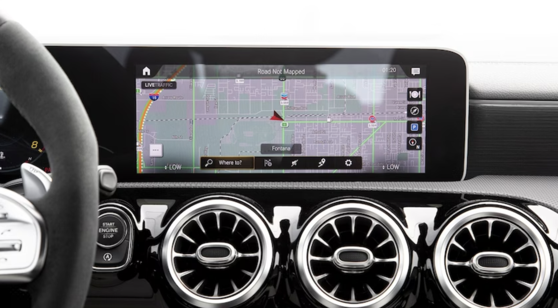 기본 모델은 7인치 화면으로 시작하지만 업그레이드로 10.3인치 장치를 사용할 수 있습니다. 이 시스템은 Apple CarPlay 및 Android Auto와 호환됩니다. MBUX 운영 체제는 음성 명령을 사용하여 활성화하거나 센터 콘솔의 터치패드를 통해 제어할 수 있습니다. 내비게이션 및 Wi-Fi 기능은 선택 사항입니다.