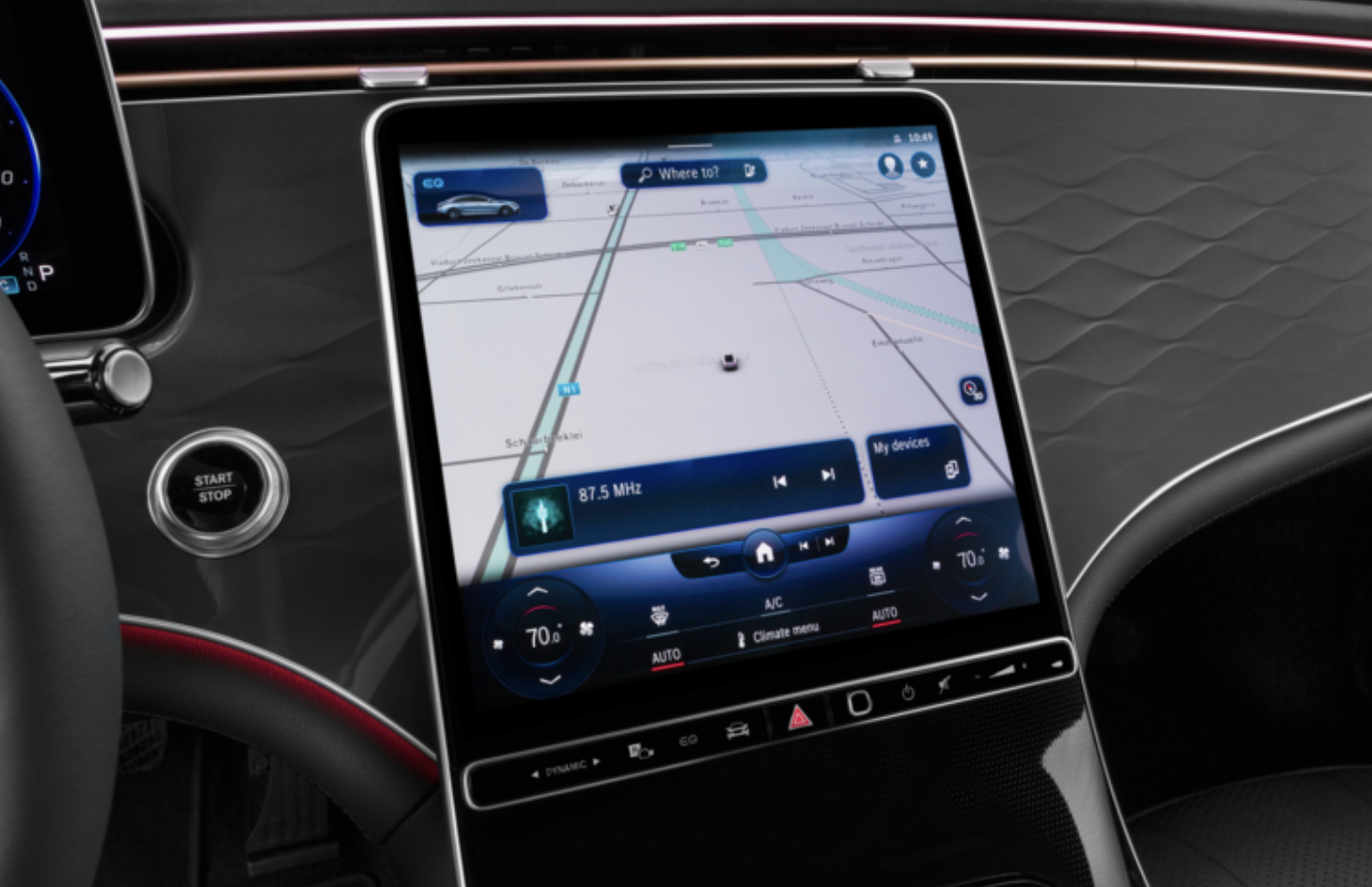 EQE에 사용 가능한 장비에는 스스로 열고 닫히는 전동식 도어, 운전자를 식별하고 프로필을 활성화하는 지문 센서 및 안면 인식, 헤드업 디스플레이, 마사지 시트, 주변 조명 등이 포함됩니다. 보다 독특한 기술 기능 중 일부에는 Silver Waves, Roaring Pulse 및 Vivid Flux와 같은 이름의 "음향 풍경"을 구동할 수 있는 Burmester 사운드 시스템이 포함됩니다. EQE에는 차량 폭을 확장하고 하나의 거대한 곡선 스크린처럼 보이는 3개의 디스플레이 대시보드인 MBUX 하이퍼스크린 기능도 옵션으로 장착할 수 있습니다.