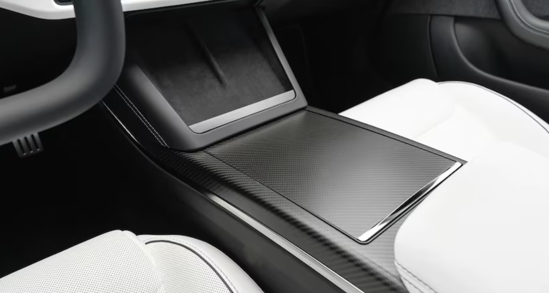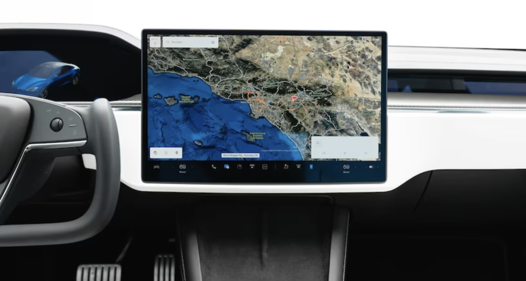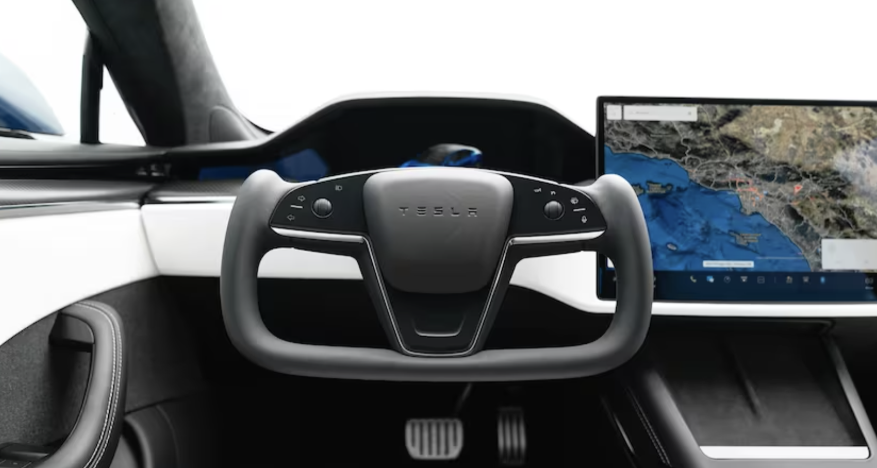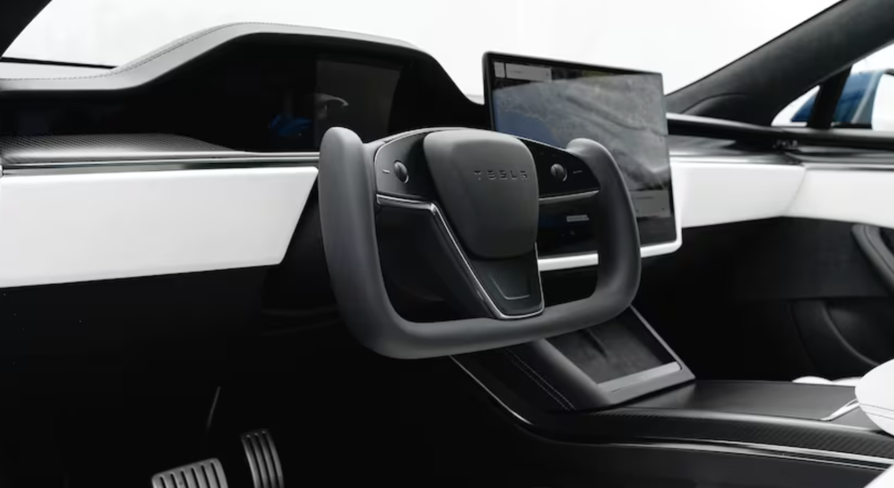 신형 모델 S에는 운전대가 없습니다. 대신 운전자는 요크(yoke)라고 불리는 직사각형 인터페이스를 통해 자동차를 조종합니다. 항공기 및 경주용 자동차에서 볼 수 있는 제어 장치와 유사한 요크에는 원형 테두리가 없기 때문에 게이지 클러스터와 전방 도로에 대한 탁 트인 시야를 제공합니다.