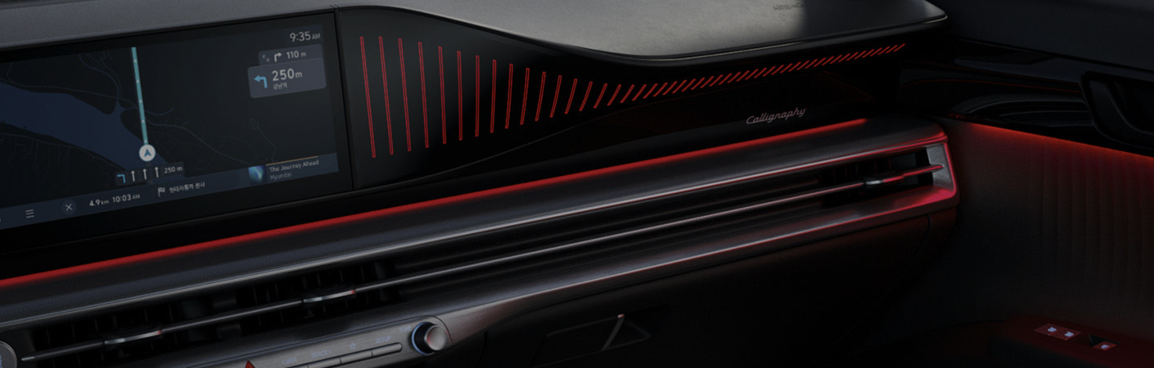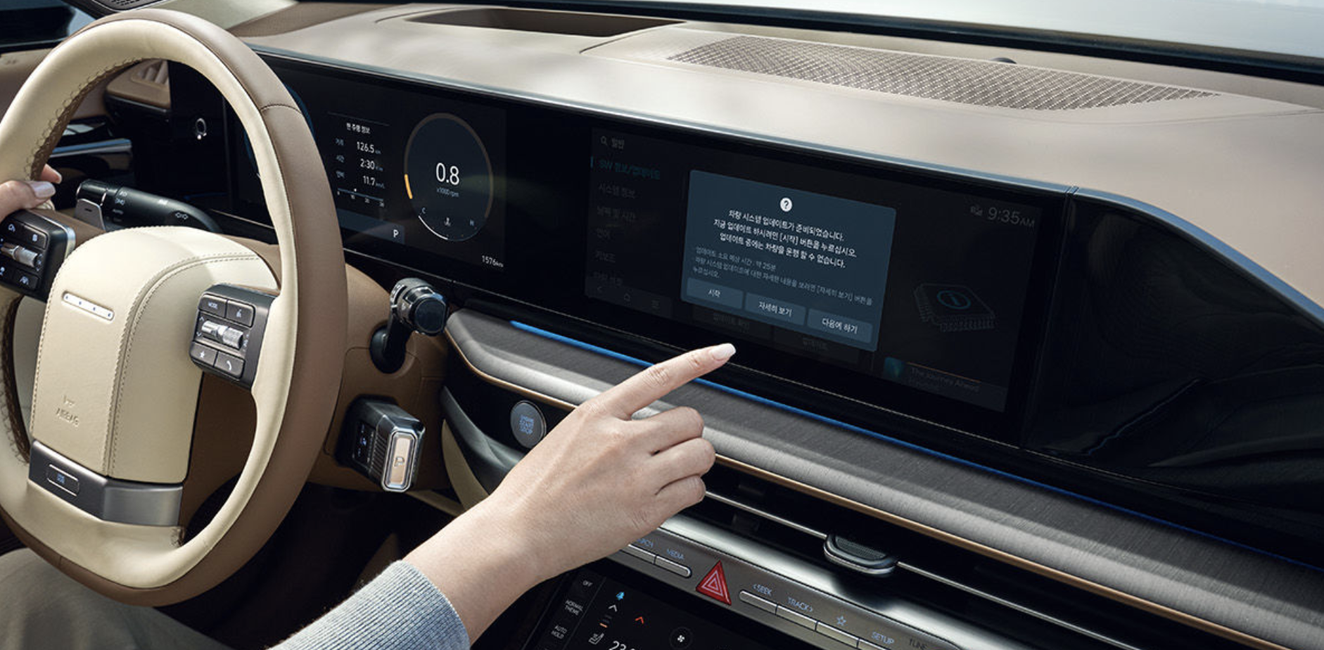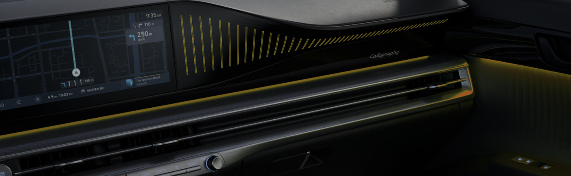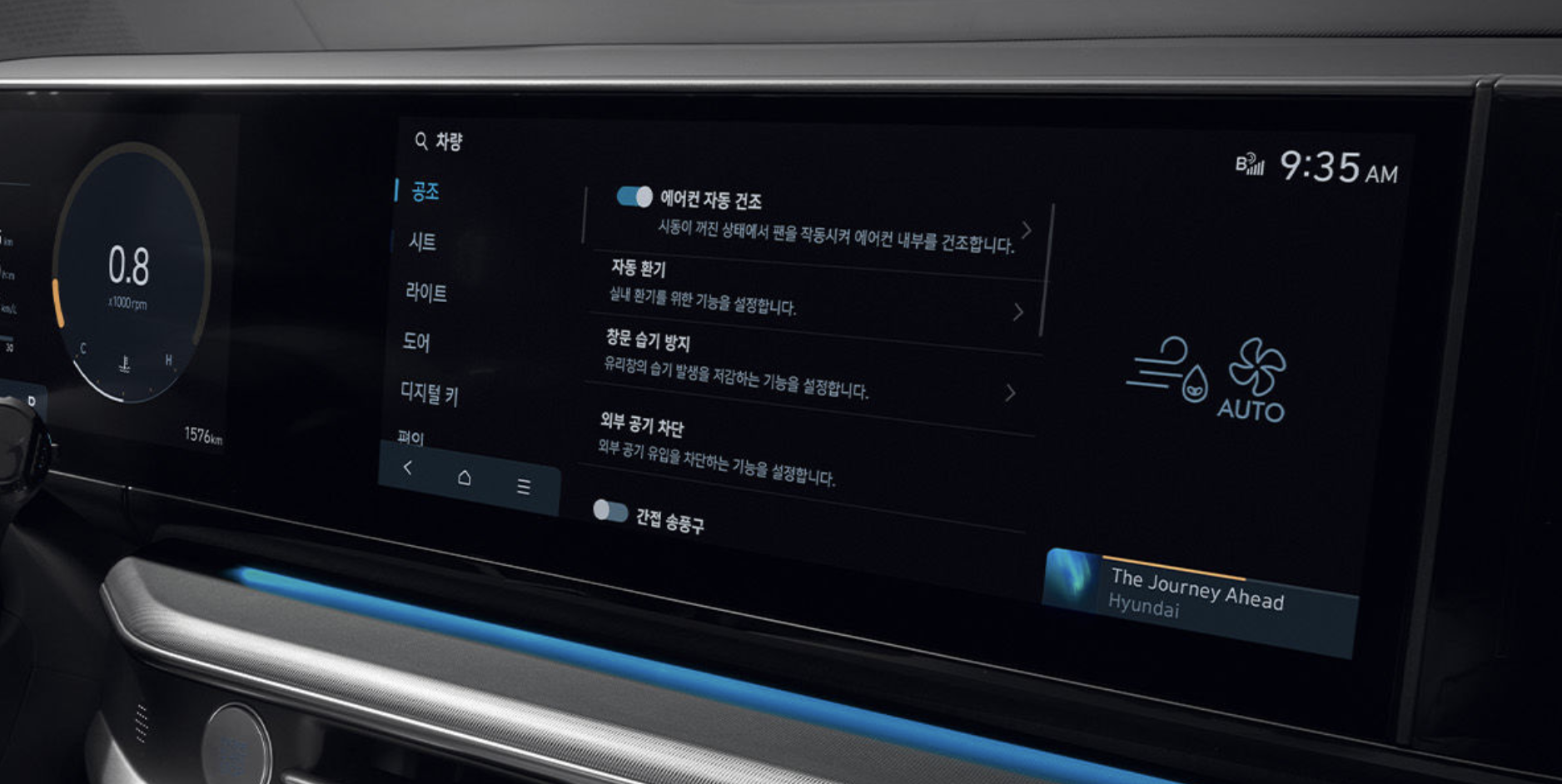 | 현대 차세대 인포테인먼트 시스템 | 파노라믹 디스플레이를 통해 클러스터, 내비게이션, 헤드업 디스플레이 간 일체감 있는 그래픽 테마를 제공하며, 자연어 기반 음성인식, 미디어 스트리밍, 실시간 길 안내 등 다양한 콘텐츠를 효과적으로 제공합니다. 무선 소프트웨어 업데이트를 통해 차량의 전자제어장치를 서비스 센터 방문 없이도 업데이트할 수 있습니다. |
