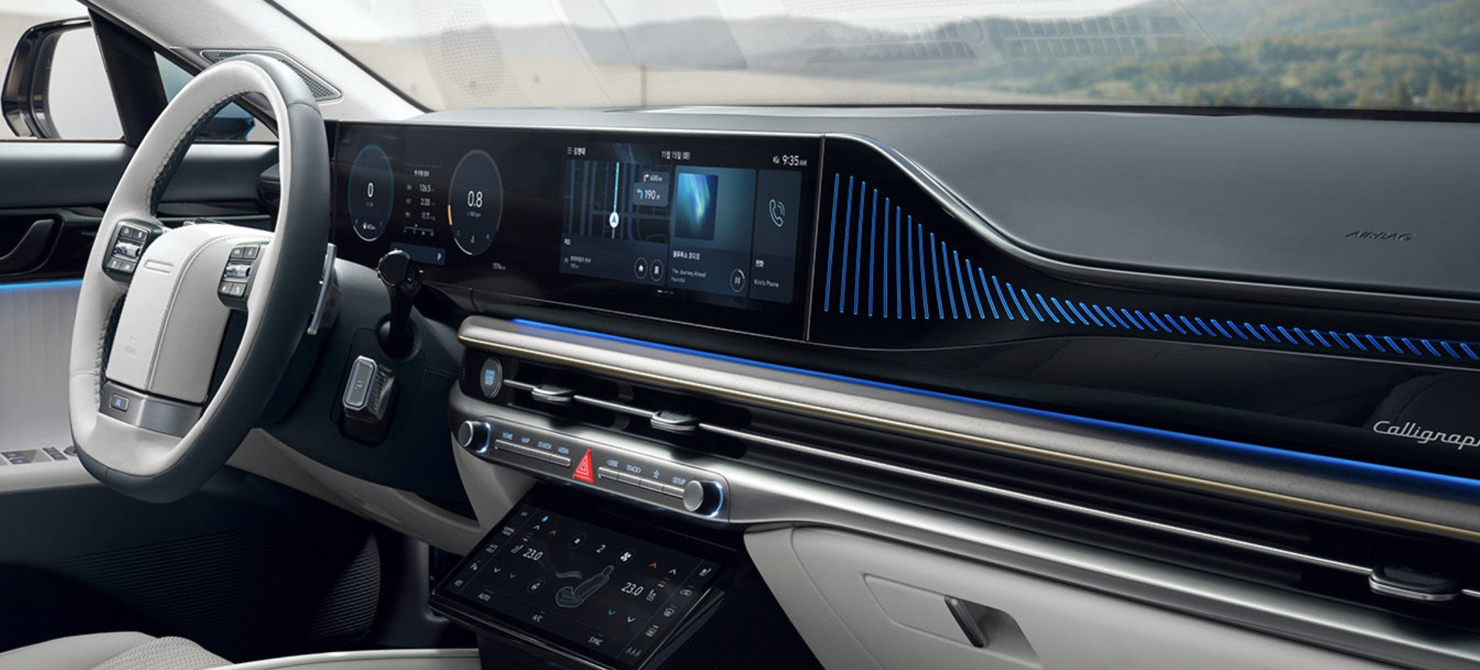 | 현대 차세대 인포테인먼트 시스템 | 파노라믹 디스플레이로 클러스터, 내비게이션, 헤드업 디스플레이 간에 일체감 있는 그래픽 테마를 구현하였으며, 자연어 기반 음성인식, 미디어 스트리밍, 실시간 긴 안내 등 다양한 콘텐츠를 제공합니다. 무선 소프트웨어 업데이트를 통해 별도의 서비스 센터 방문 없이도 차량의 주요 전자제어장치에 대한 업데이트가 가능합니다. |