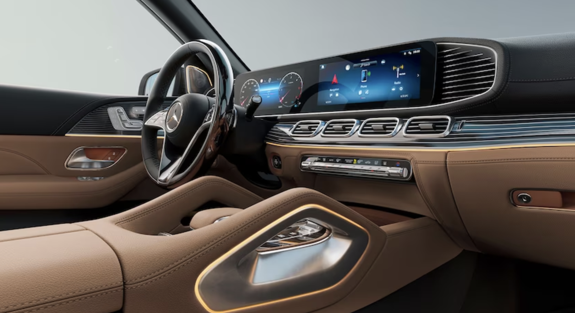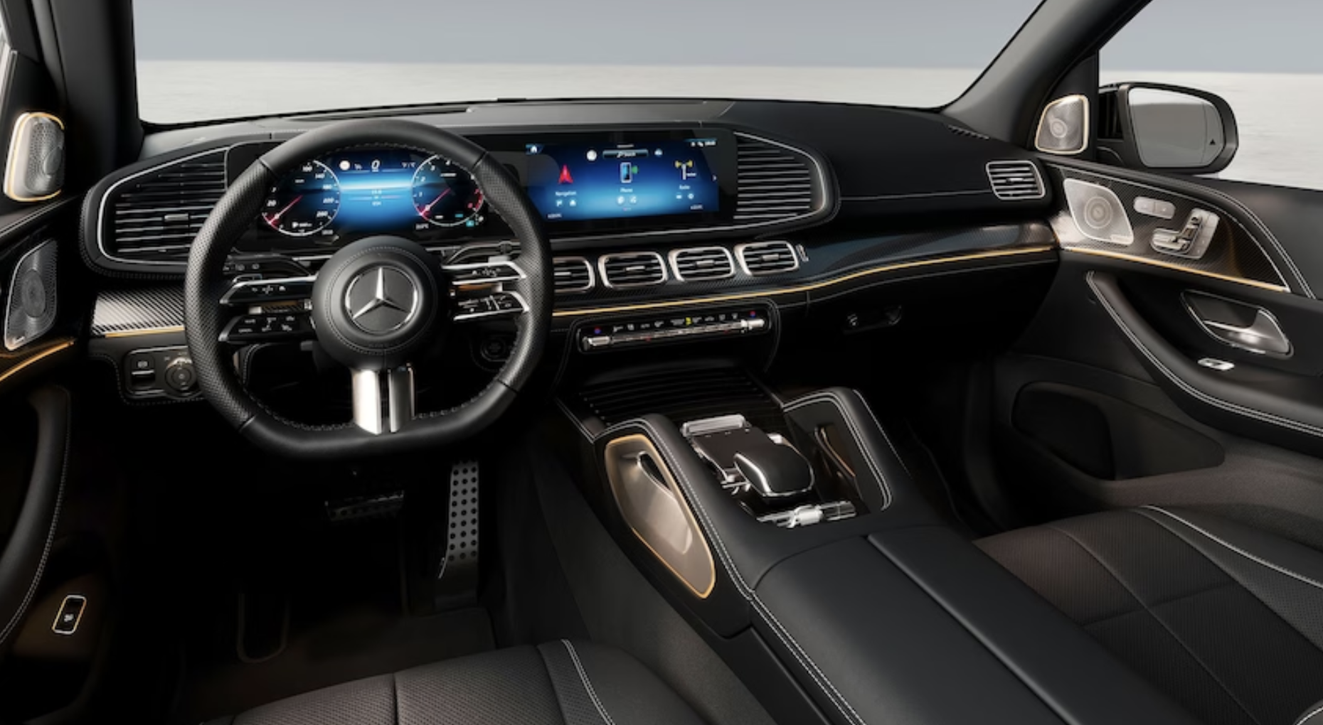 모든 2024년형 GLS-클래스에는 대시보드에 듀얼 12.3인치 디스플레이가 장착됩니다. 운전자 앞의 디스플레이 중 하나는 게이지 클러스터로, 그 옆의 디스플레이는 인포테인먼트 터치스크린으로 작동합니다. 최신 버전의 메르세데스 MBUX 사용자 인터페이스와 함께 내장 내비게이션, Apple CarPlay 및 Android Auto가 표준입니다.