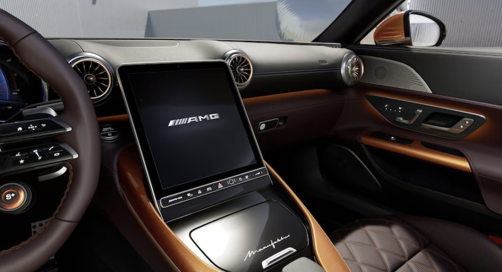 모든 2024 SL-클래스에는 12.3인치 디지털 게이지 클러스터가 장착되어 있지만 파티피스는 11.9인치 인포테인먼트 터치스크린입니다. 이 중앙 디스플레이는 하향식 운전 중 햇빛 눈부심을 최소화하기 위해 각도를 조정할 수 있습니다.