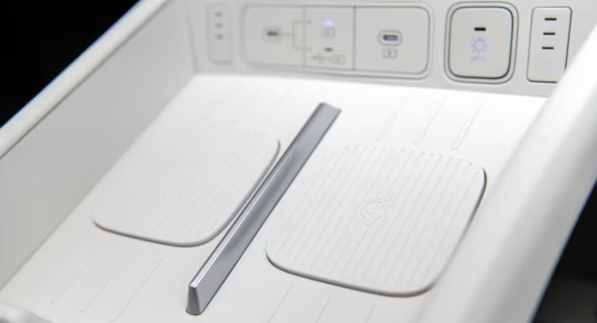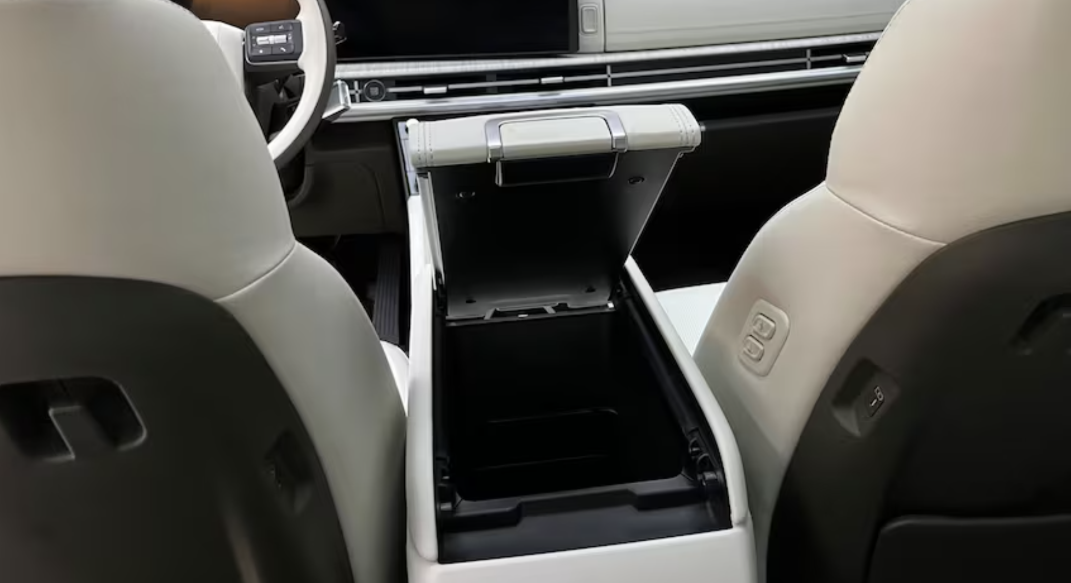 2024년 쏘나타와 마찬가지로 싼타페의 시프터가 스티어링 칼럼으로 이동해 센터 콘솔의 공간이 확보됩니다. 이 새로운 설정을 통해 엔지니어는 첫 번째 무선 충전기 옆에 두 번째 무선 휴대폰 충전기를 추가하고 중앙 섹션에 두 번째 대형 컵홀더를 추가할 수 있습니다. 글로브박스에는 UV-C 소독제 트레이도 있습니다.