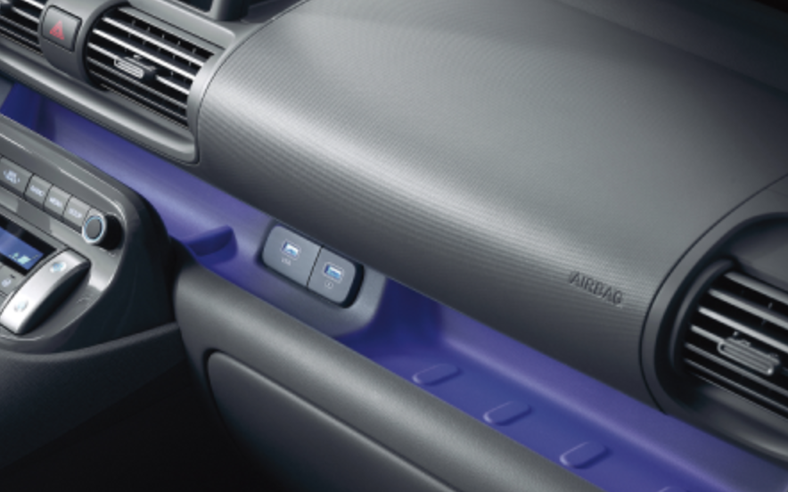 차량은 4.2인치 클러스터를 통해 정보를 제공하며, 블루링크를 통해 원격으로 차량을 제어할 수 있습니다. 실내에는 무드 램프와 USB 충전기가 있어 편의성을 높이고, 버튼 시동과 스마트 키를 통해 편리하게 운전할 수 있습니다. 또한 8인치 내비게이션 시스템은 블루링크, 폰 프로젝션 및 현대 카페이와 함께 다양한 네비게이션 기능을 제공하며, 풀 오토 에어컨은 자동으로 온도를 조절하여 내부 환경을 최적화합니다.