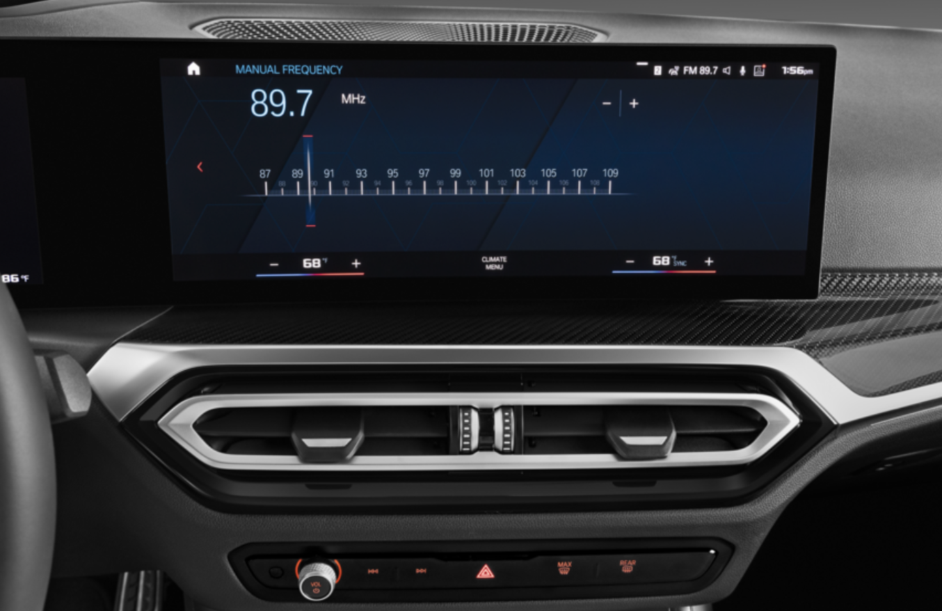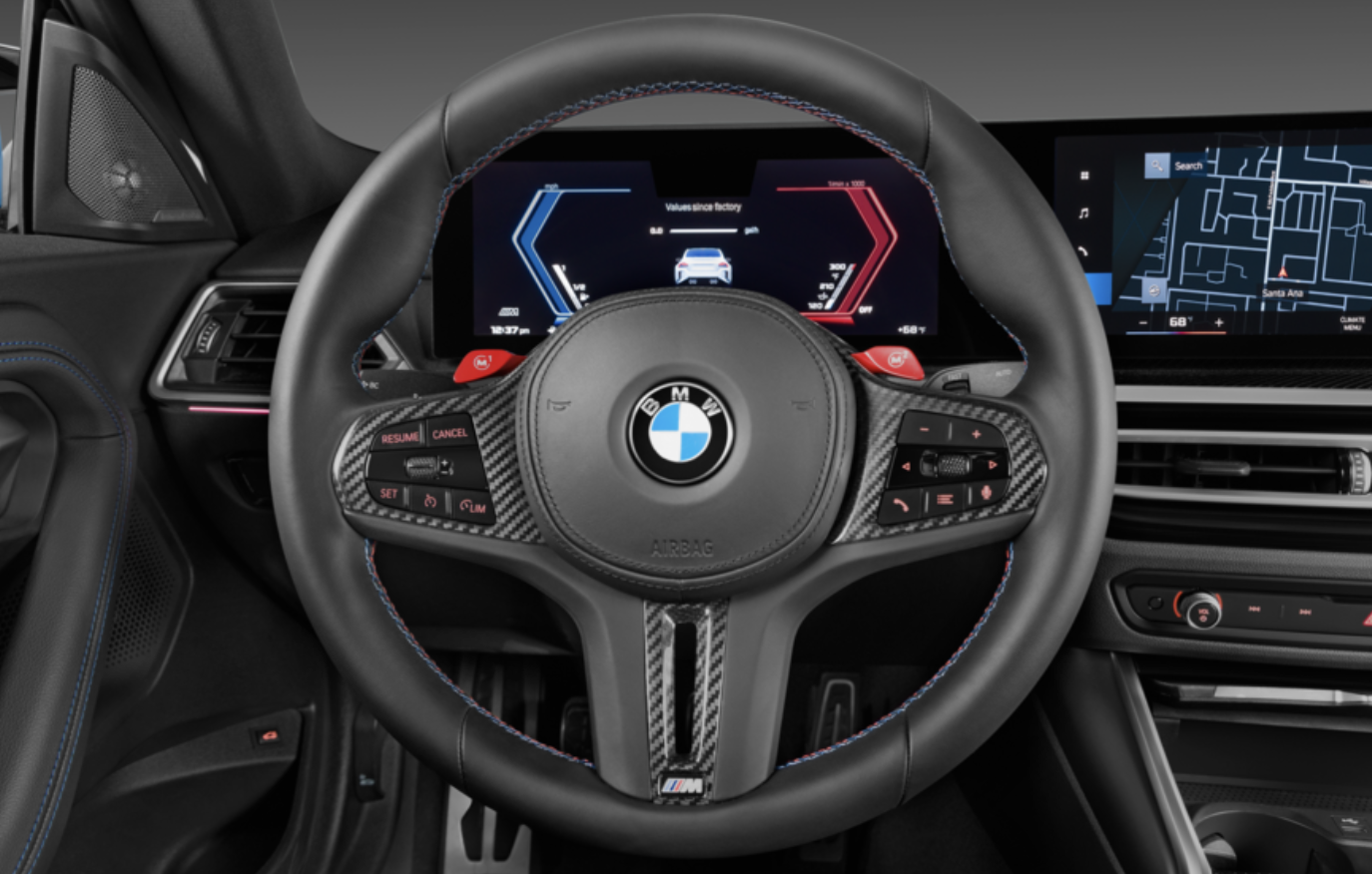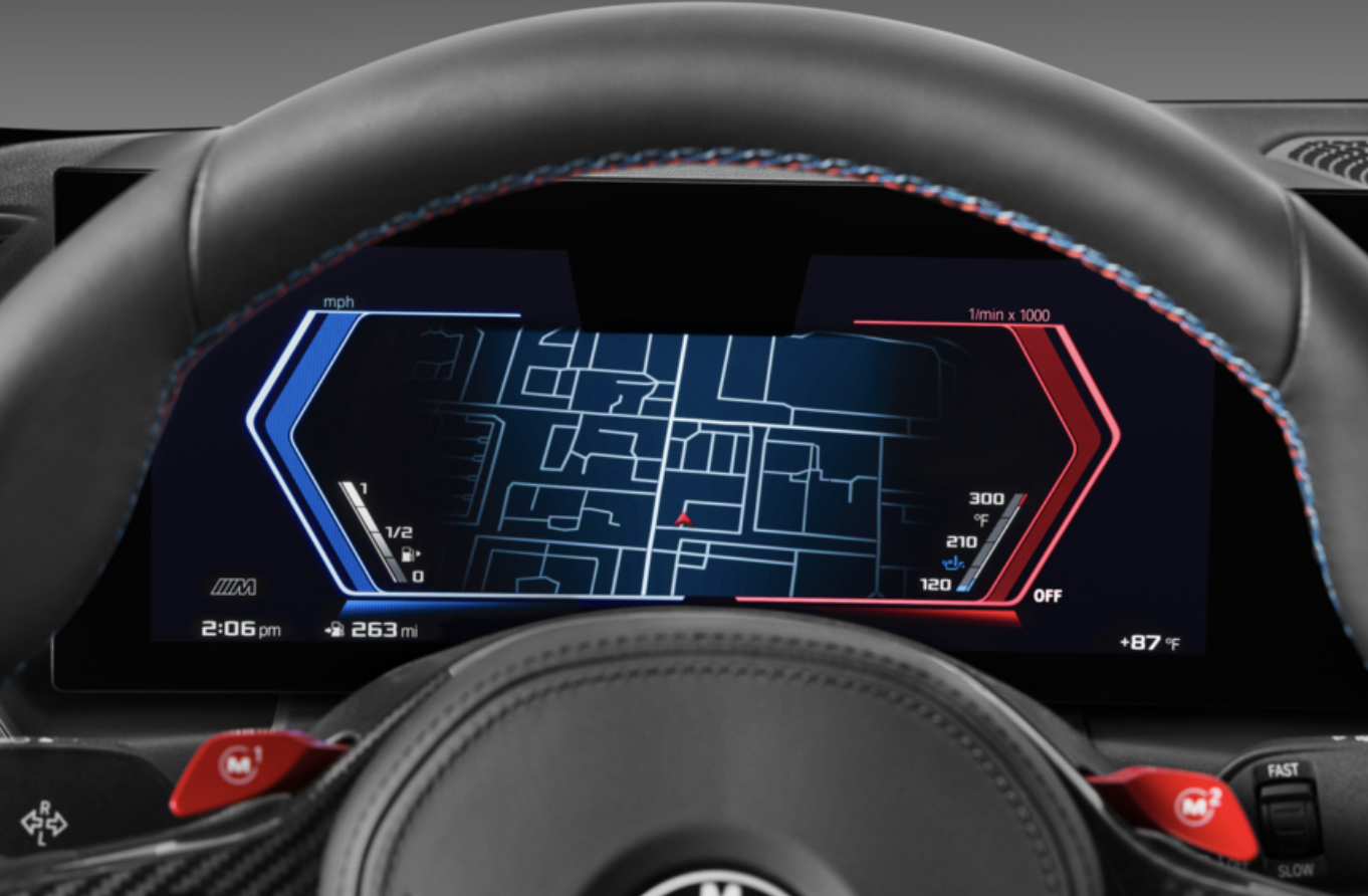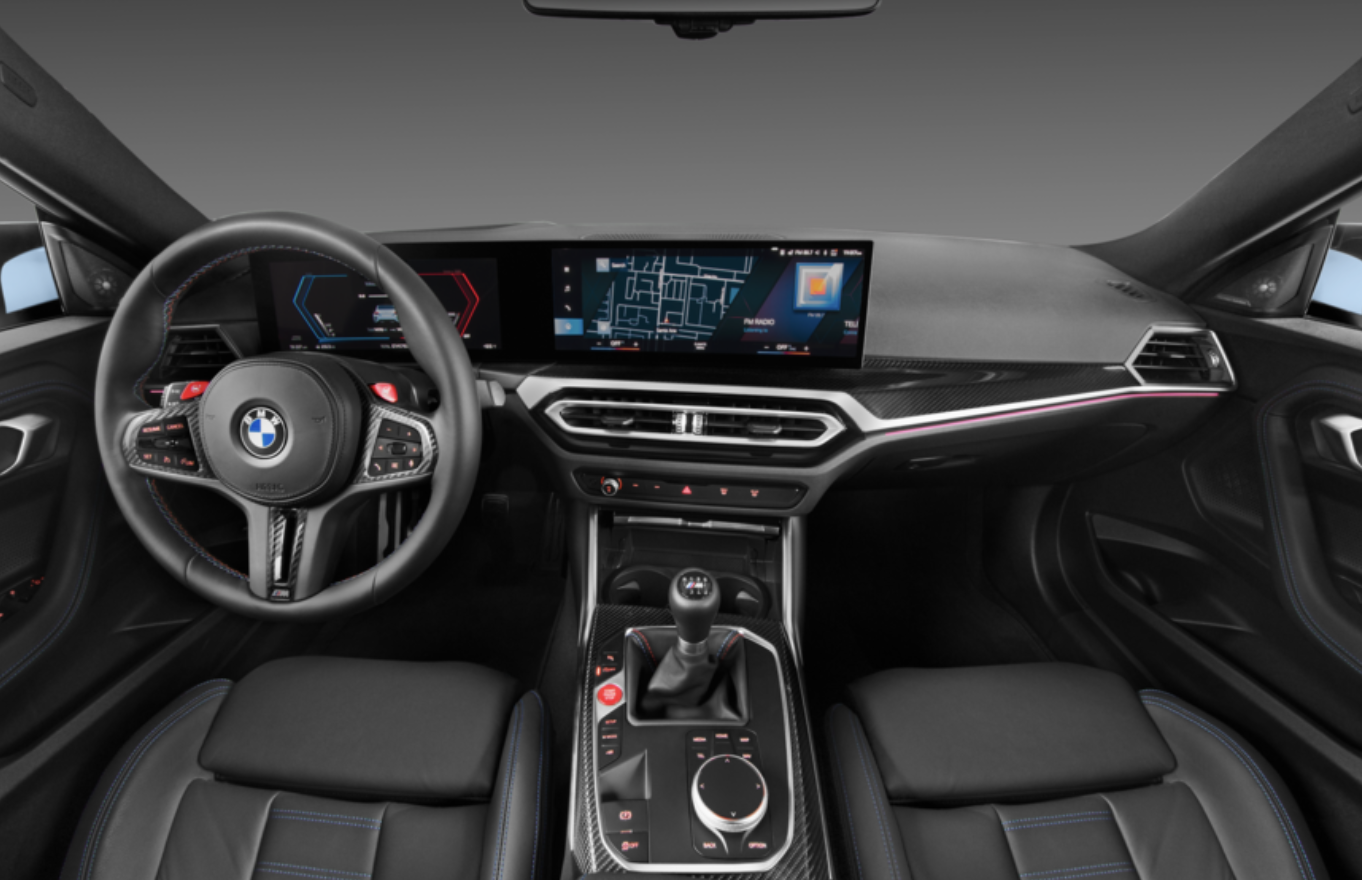 모든 M2에는 12.3인치 디지털 계기판과 거대한 14.9인치 터치스크린 인포테인먼트 디스플레이로 구성된 BMW의 최신 기술 제품군이 장착되어 있으며, 둘 다 단일 곡면 유리 패널 뒤에 수용되어 있습니다.