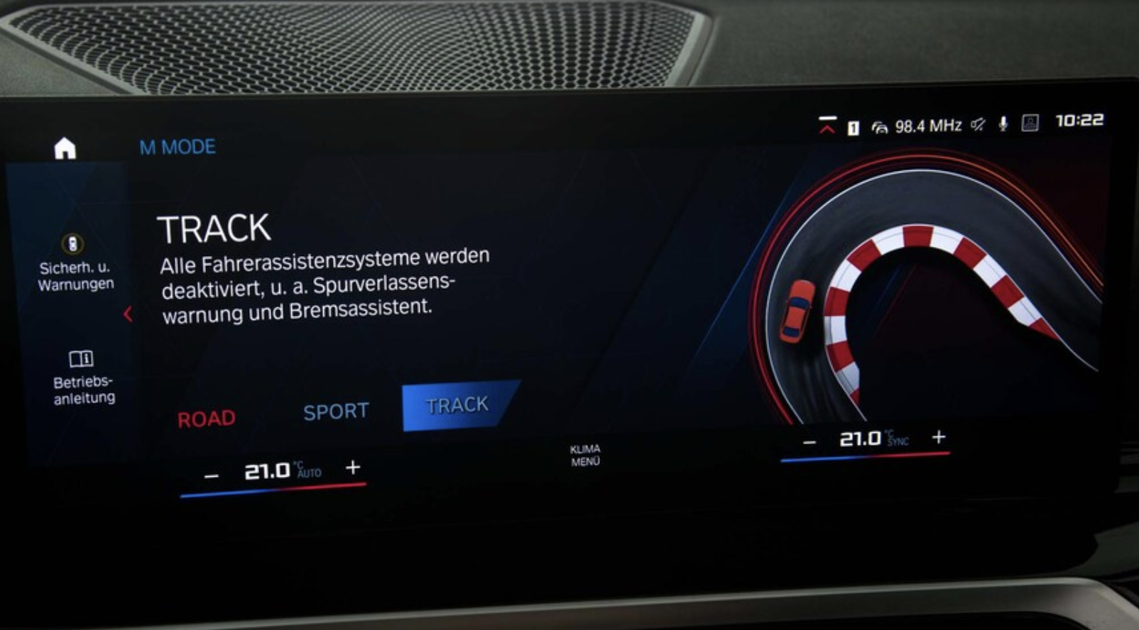 Apple CarPlay 및 Android Auto가 표준입니다. M2는 로드, 스포츠, 트랙 주행 모드뿐 아니라 스티어링 휠의 버튼으로 쉽게 접근할 수 있는 두 가지 구성 가능한 주행 모드도 제공합니다. 구동계, 조향 및 핸들링 특성을 변경하는 것 외에도 다양한 주행 모드는 계기판에 다양한 테마를 표시합니다. 트랙 모드는 인포테인먼트 디스플레이를 꺼서 방해를 최소화합니다.